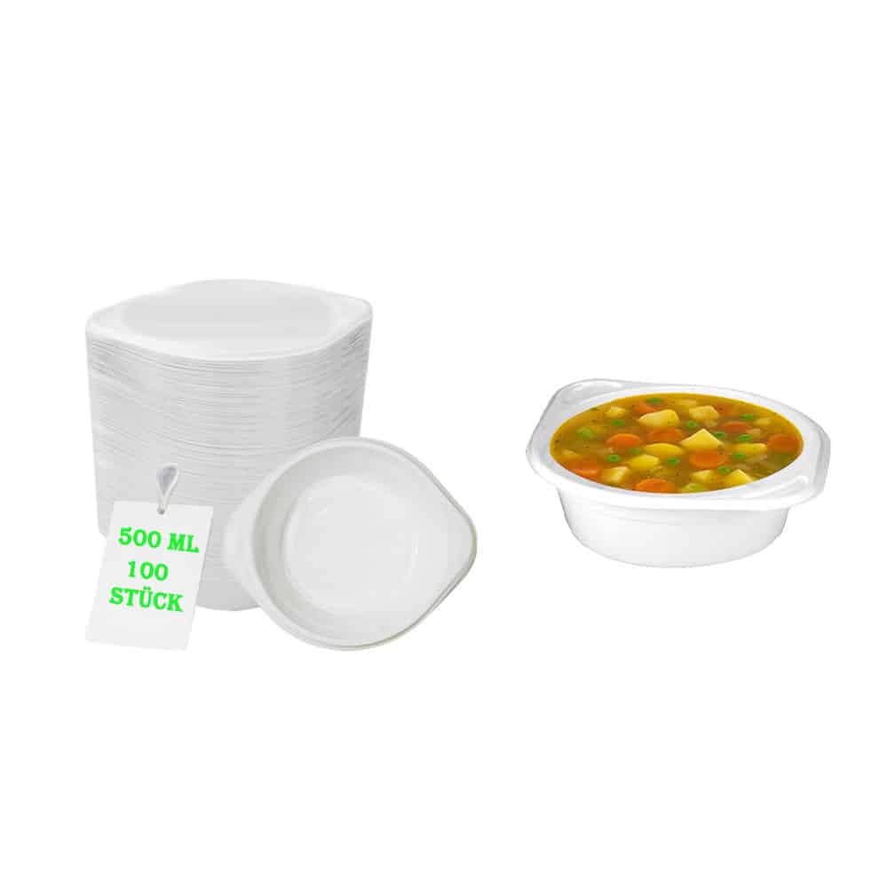 Die Suppenschalen sind lebensmittelgeeignet, geruchsneutral und BPA-frei. Mit ihrem schlichten weißen Design eignen sie sich für die Ausgabe und Präsentation verschiedener Speisen. Das Fassungsvermögen von 500 ml bietet eine praktische Größe für Suppenportionen, Salate, Desserts oder andere Speisen.